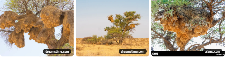- درخت شترخار (Camel Thorn – Vachellia erioloba): درخت اصلی در کالاهاری، با شاخههای محکم که وزن لانههای سنگین را تحمل میکند (1).