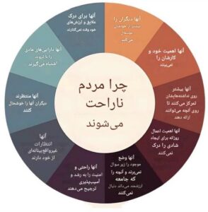 شکل شماره ۳: اینفوگرافی از “چرا مردم ناراحت میشوند؟” یک چرخه با آیکونهای ساده برای هر عامل، با فلشهایی به سوی “راهحل: قدرشناسی و پذیرش”.