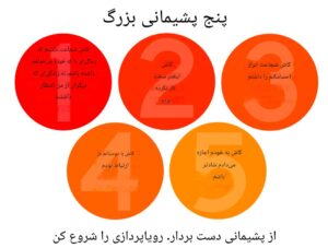 نمودار شماره ۲: پنج عامل اصلی پشیمانی انسانها (مثلاً: اولویت کار بر روابط، نادیده گرفتن سلامت، مقاومت به تغییر، مقایسه با دیگران، عدم بخشش – بر اساس دادههای روانشناختی رایج).