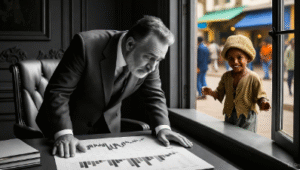 شکل شماره ۲: عکسی واقعیگرا از یک تاجر میانسال در دفتر لوکس، خمشده بر میز پر از نمودارهای مالی، با چهرهای خسته و چشمانی خالی ، در پسزمینه، پنجرهای باز به سوی خیابانی شلوغ با کودکان نیازمند.