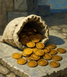 شکل شماره ۱: تصویر بالا از یک کیسه کهنه طلا، نیمهباز روی زمین سنگی، با ۹۹ سکه درخشان بیرونریخته و یک سایه بلند (نماد حسرت) که بر آنها افتاده.