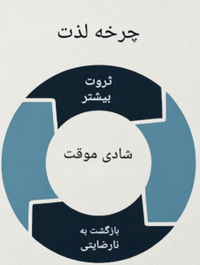 در این اینفوگرافی ساده، چرخه ی دایرهای نشاندهنده “چرخه هدونیک”، با فلشهایی که از “ثروت بیشتر” به “شادی موقت” و سپس “بازگشت به نارضایتی” میروند.