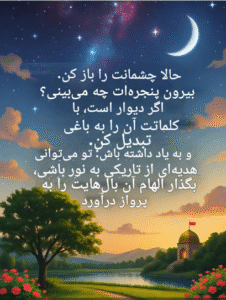 حالا، چشمانت را باز کن. بیرون در پنجرهات چه میبینی؟ اگر دیواری است، با کلماتت آن را به باغ بدل کن. و یادت نرود: تو میتوانی هدیهای از تاریکی به نور باشی و اجازه دهید الهامش، بالهایت را به پرواز درآورد.